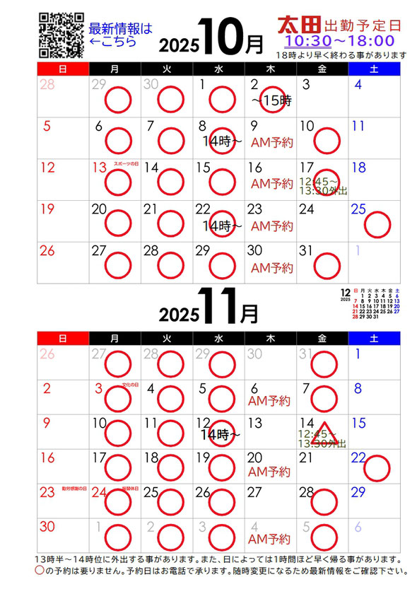 太田をご用命の方は、出勤日が不定期なので下の予定表をご覧頂き、